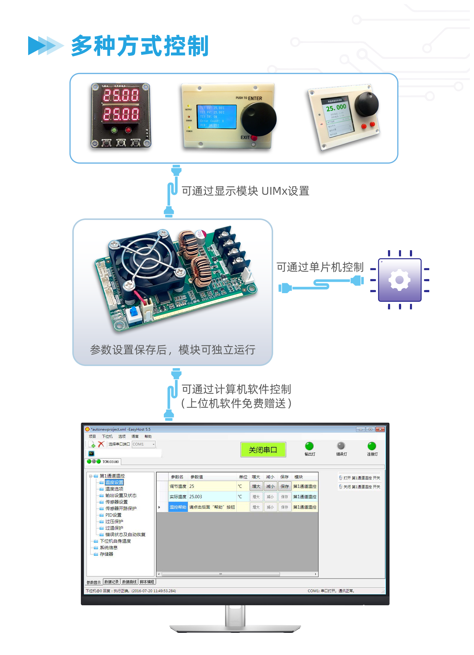 各种参数都可以在用户软件中调节、设置、保存,方便用户在不同的温控系统中使用该温控模块