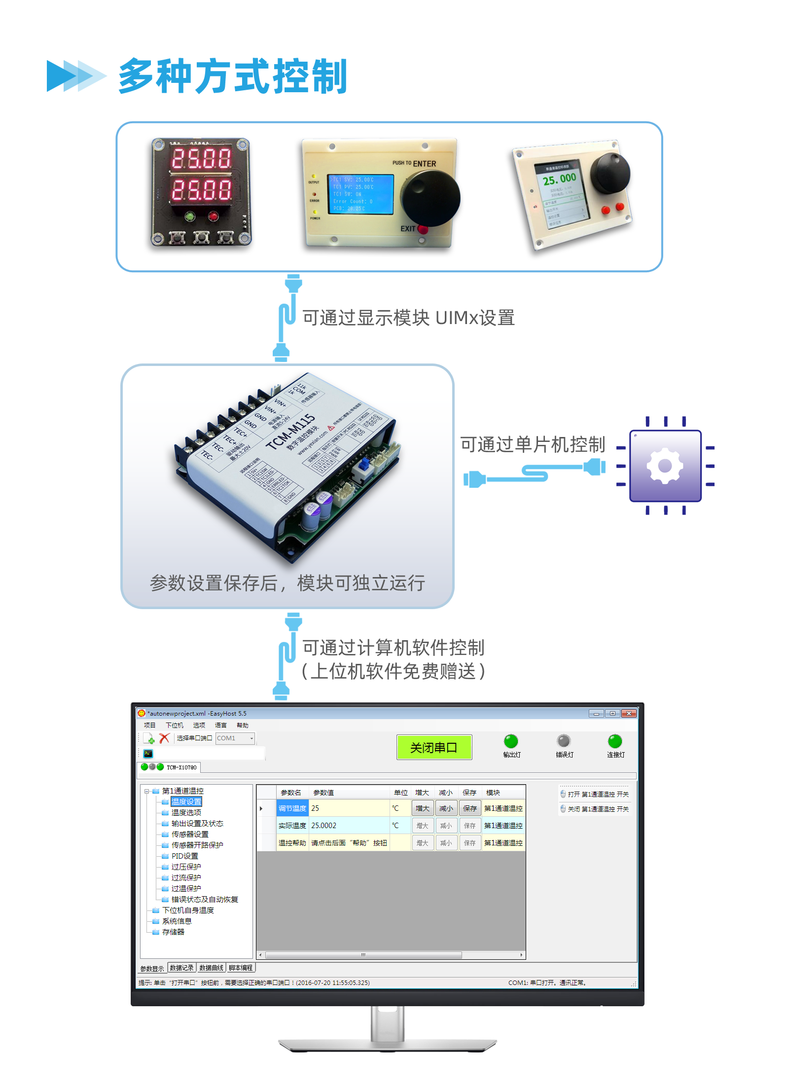 提供完整串口控制命令,用户可自己编程通过计算机或单片机控制温控模块;