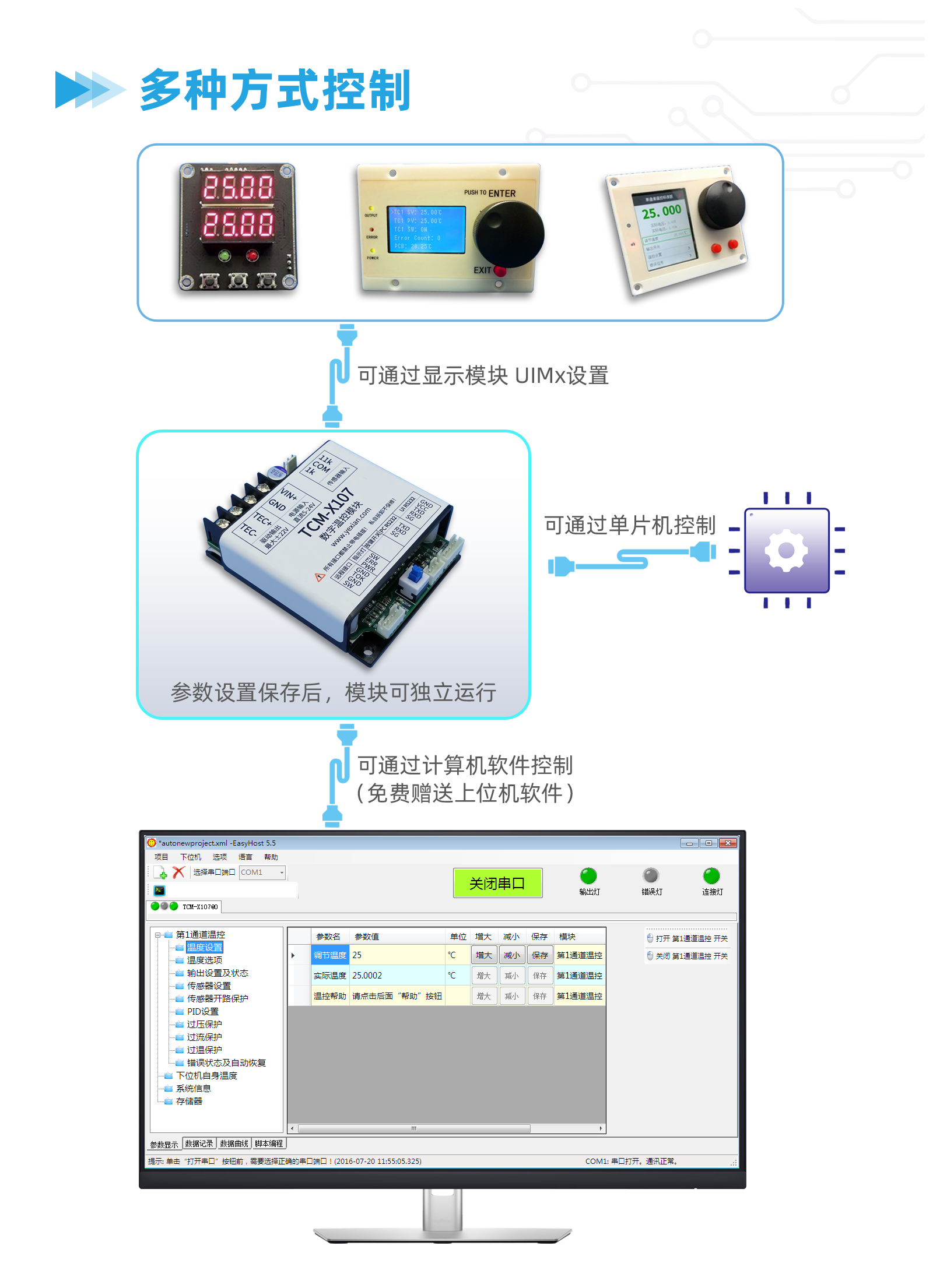 提供完整串口控制命令,用户可自己编程通过计算机或单片机控制温控模块;