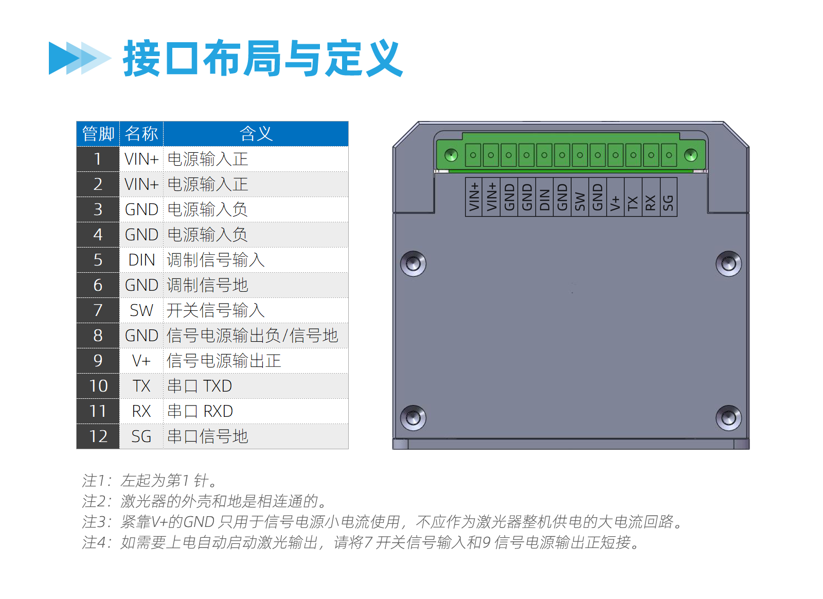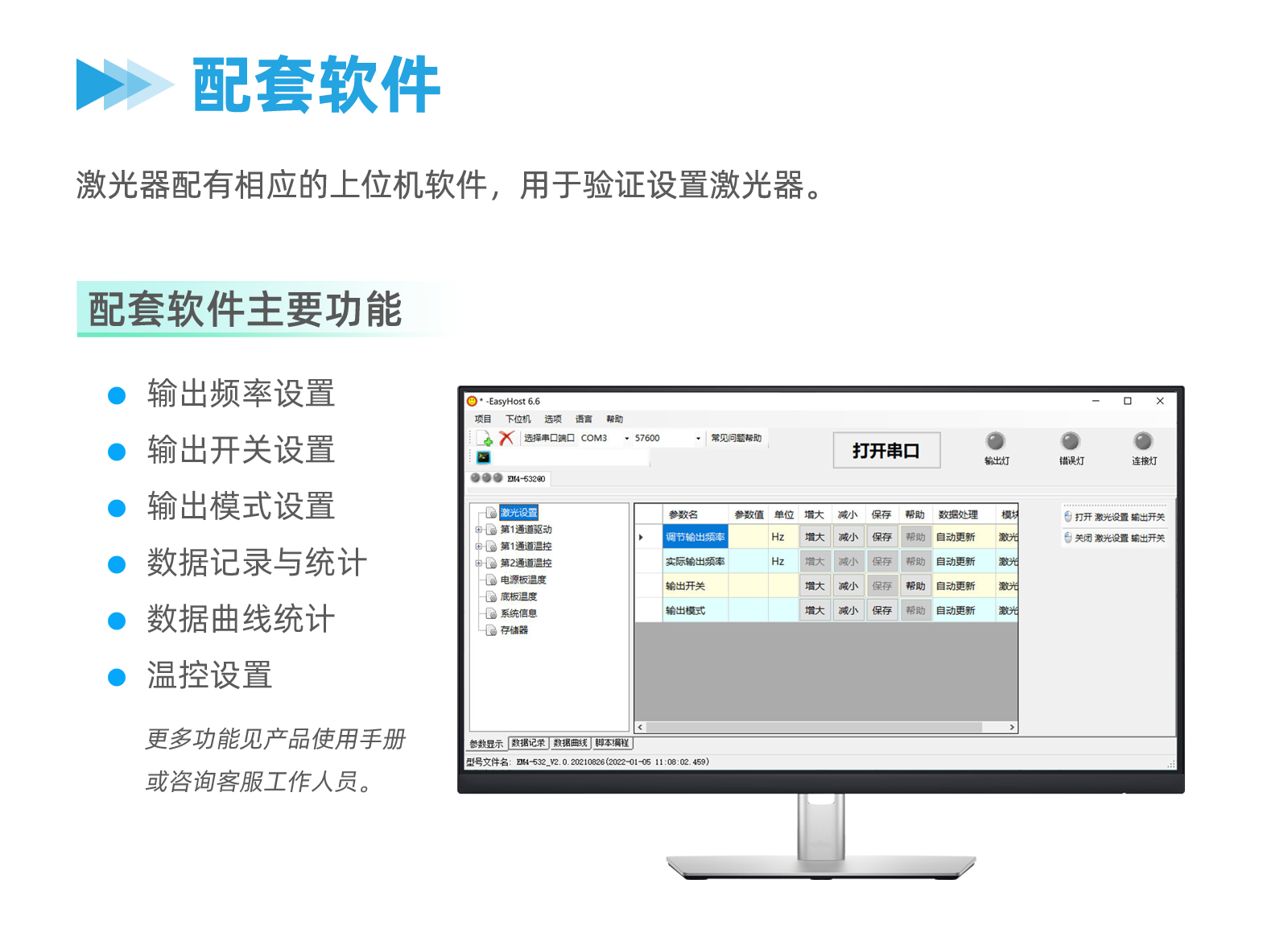 EM4-B激光器所使用的驱动电源体积小巧,并与激光器集成为一体,通过12V5A直流电源供电;产品造型美观、整体结构小巧、单机、便于操作,易于直接嵌入用户设备中,使用十分方便。