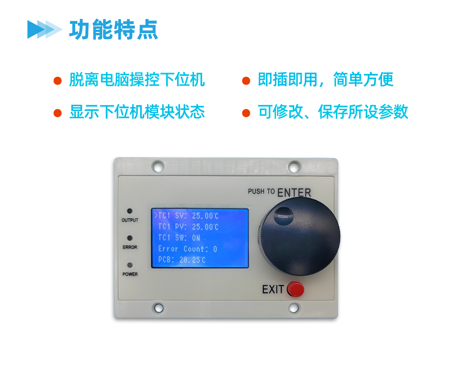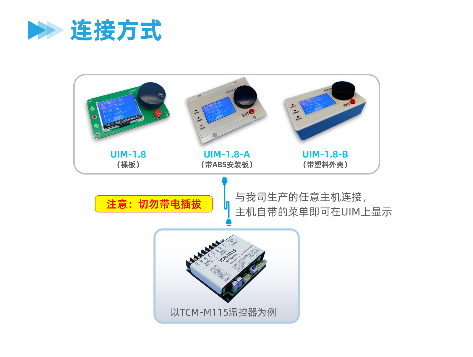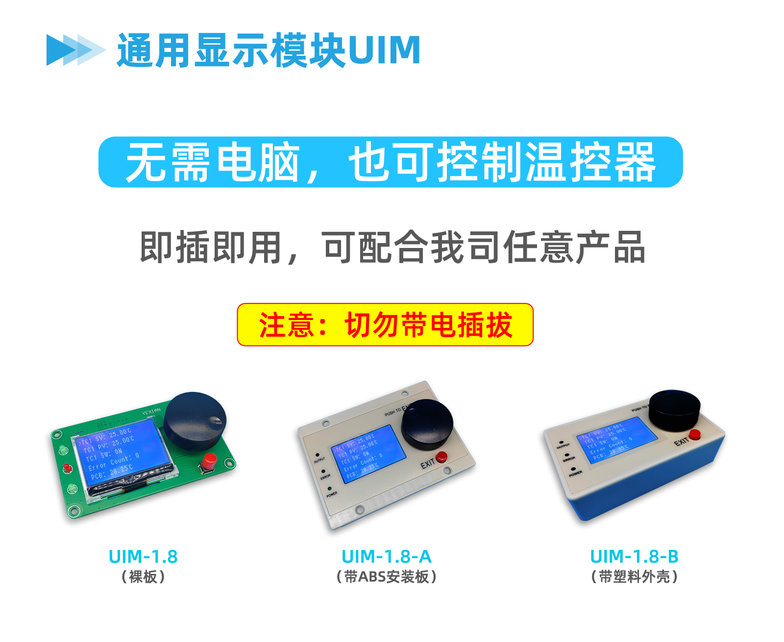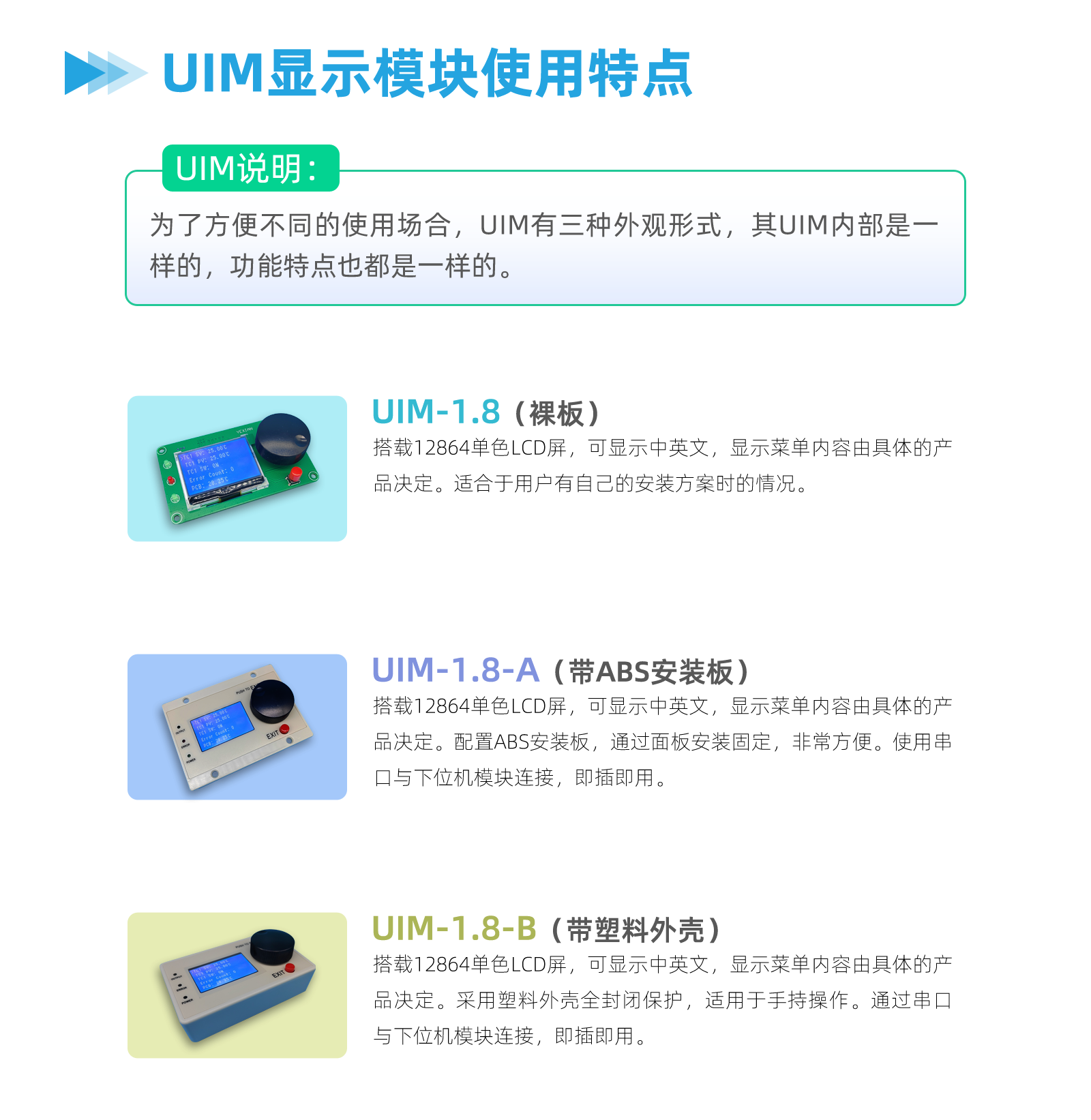 有时,不方便连接电脑,因此需要1个无电脑的方案。显示模块UIM可以完成该功能。为了实现该功能,我们的产品几乎都提供1个基本的菜单系统,UIM可以显示该菜单。