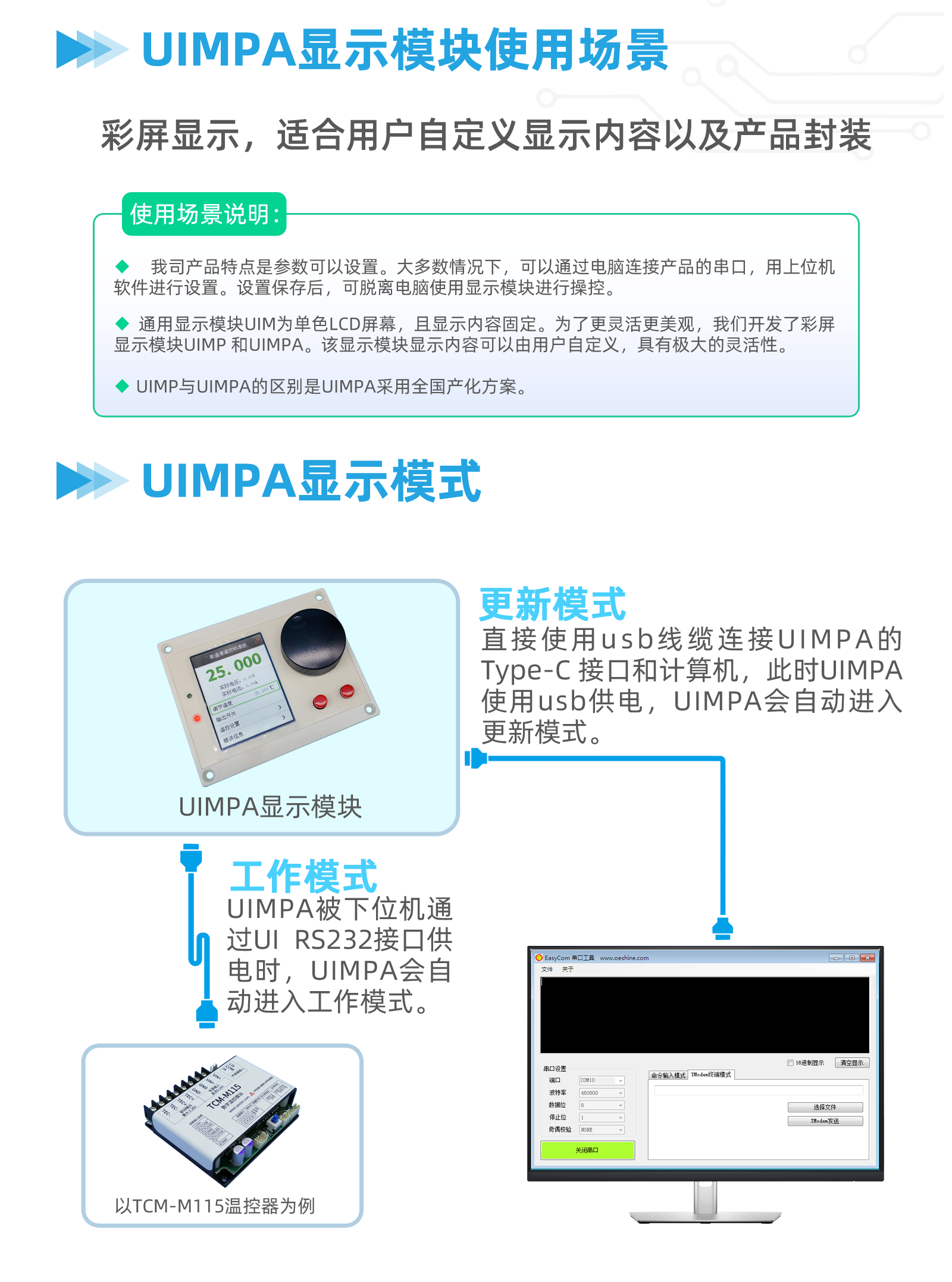 有时,不方便连接电脑,因此需要1个无电脑的方案。我司提供1个通用显示模块UIM可以完成该功能,但是UIM的显示内容固定。