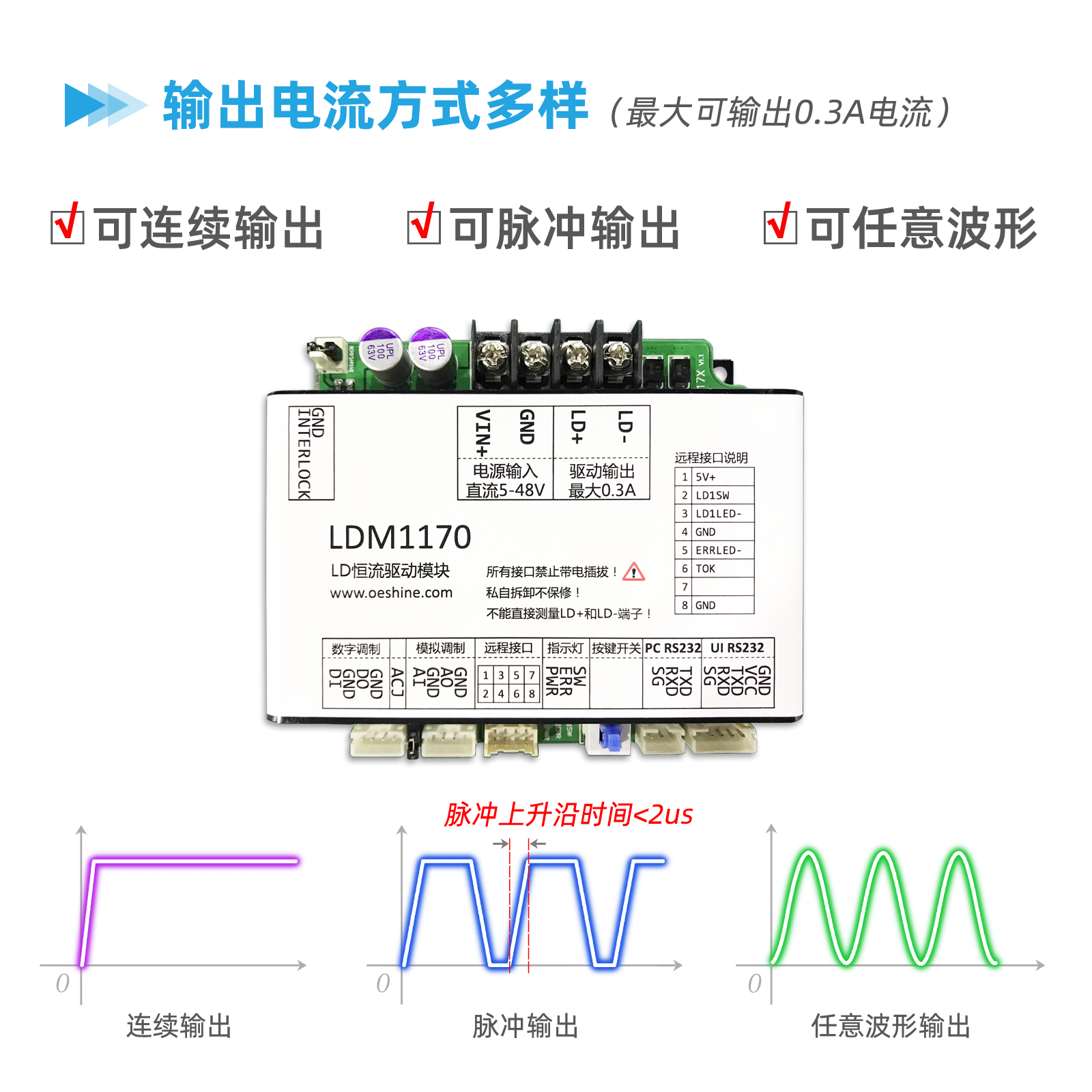 - 可输出连续电流;也可数字调制输出脉冲电流;也可模拟调制输出任意波形电流。