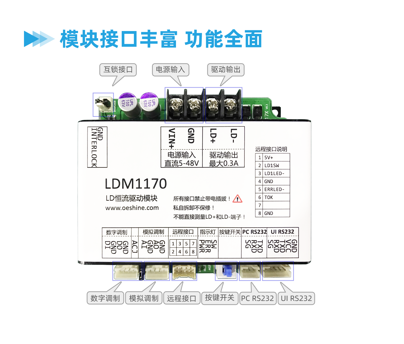 线性恒流源驱动模块,高速驱动小电流LD(Laser diode,激光二极管)半导体激光器(最大值1A),电流源输出,输出电压自适应,输出电流可通过手持用户接口模块UIM或者上位机软件灵活设置。