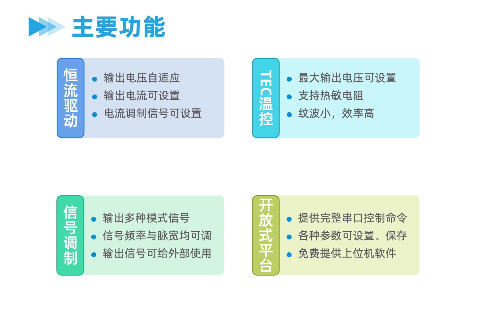 - 强大灵活性:各种参数都可以在用户软件中调节、设置、保存,方便用户用来驱动不同的半导体激光器。