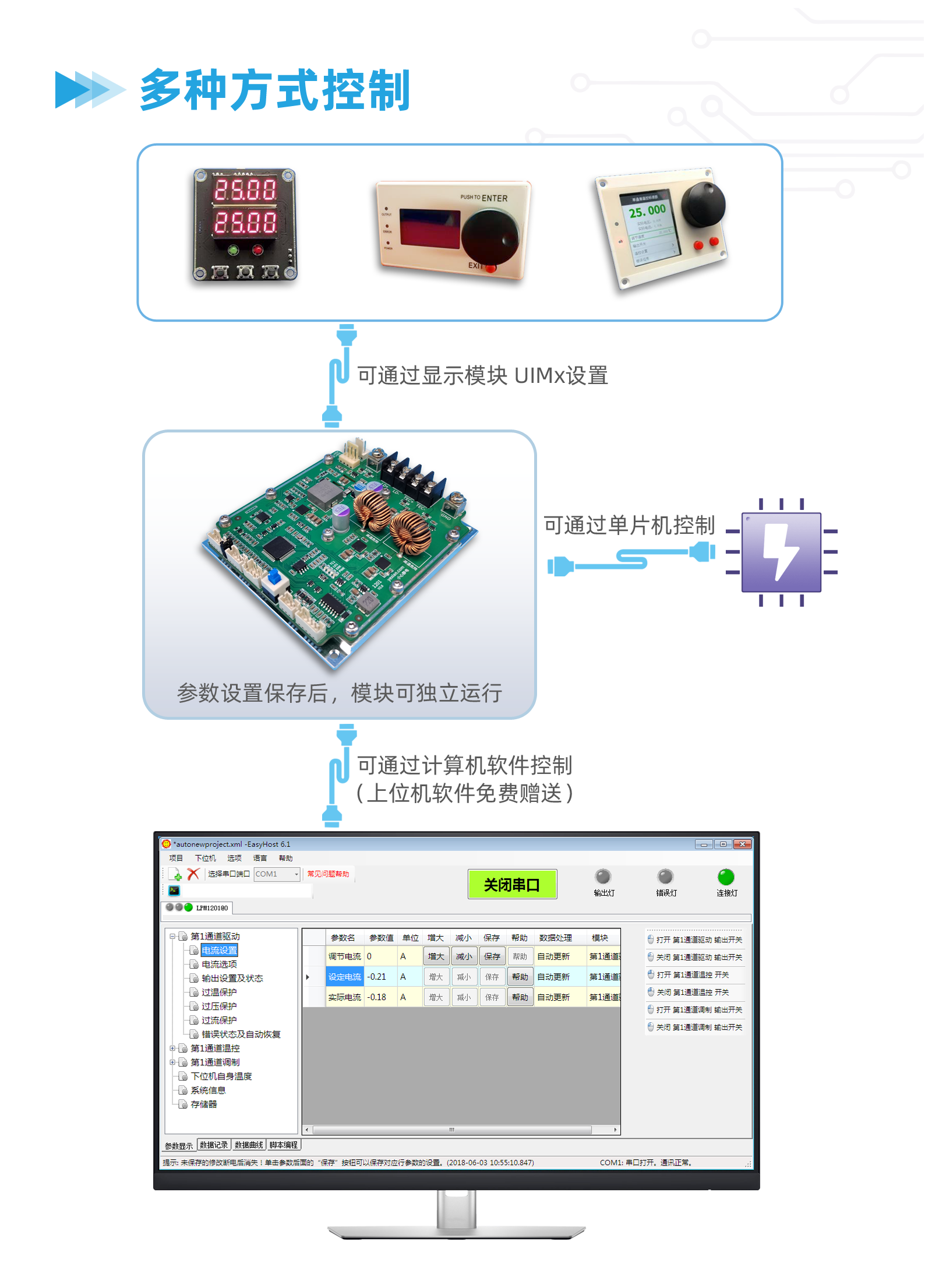 - 开放式平台:提供完整串口控制命令,用户可自己编程通过计算机或单片机控制驱动模块;免费提供上位机软件,可实现参数观测、设置、数据记录和曲线显示等功能。